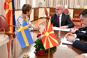 Претседателот ја реафирмираше благодарноста за силната поддршка на Кралството Шведска на евроатланската интеграција на Република Северна Македонија, особено ценејќи го фактот што Шведска е силен поборник на политиката на проширување, имајќи предвид дека не сите земји членки на ЕУ го делат истиот ентузијазам и ја поздрави ревизијата на Стратегијата на Шведската влада за развојна соработка со источна Европа, Западен Балкан и Турција 2014-2020, со обнова на билатералната компонента во соработката меѓу Кралството Шведска и Република Северна Македонија. Од особено значење е и Декларацијата за соработка меѓу Република Северна Македонија и Кралството Шведска, со која се реафирмира поддршката за нашите стратегиски приоритети и се дефинираат конкретни области од заемен интерес, на билатерален и на мултилатерален план. Тој исто така подвлече дека, шведската поддршка на интеграцијата на Република Северна Македонија во НАТО е високо ценета, имајќи ја предвид шведската неутралност во воените сојузи. Претседателот Џафери ја информираше амбасадорката и за финализирањето на членството на Република Северна Македонија во НАТО Алијансата, при што очекувањата се на почетокот на следната година да станеме 30-та полноправна земја-членка, имајќи во вид дека се останати вкупно 6 земји-членки чии парламенти треба да го ратификуваат Пристапниот протокол, по што ќе следи и официјализирањето на полноправното членство и ратификацијата на основните НАТО протоколи во нашето Собрание. Двајцата соговорници во овој контекст споделија видувања дека, членството во Алијансата дополнително ќе ја зајакне регионалната стабилност и безбедност, но и ќе значи голема економска придобивка за самата држава, како што тоа се покажало и досега кај сите ново примени земји-членки.