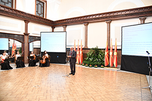 Добродојдовте на одбележувањето на овој исклучително значаен историски ден. Имам чест што денес сум домаќин на овој настан, како што впрочем е и редот, со оглед на тоа што токму овде, во законодавниот дом, во домот на граѓаните, пред точно дваесет и осум години, нашите колеги од тој пратенички состав, ја ставија на хартија и во живот одлуката на граѓаните од спроведениот референдум на 8-ми Септември 1991 година кога вековниот сон, вековната желба за слободна, независна, суверена држава се оствари бидејќи граѓаните се определија за таква самостојна, суверена држава чии што основни постулати за развивање на граѓанското општество беа вградени и во највисокиот законодавен акт - во Уставот на државата. Покрај тоа, беа детерминирани и стратешките цели од суштинска важност за напредокот на државата, цели за кои имавме и се уште споделуваме заедничка определба мнозинството граѓани уште на самиот почеток на самостојноста, а тоа е полноправното членство и интеграција во Европската Унија и НАТО.