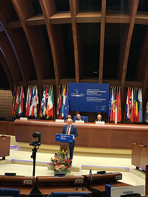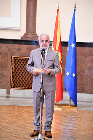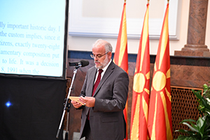 Добродојдовте на одбележувањето на овој исклучително значаен историски ден. Имам чест што денес сум домаќин на овој настан, како што впрочем е и редот, со оглед на тоа што токму овде, во законодавниот дом, во домот на граѓаните, пред точно дваесет и осум години, нашите колеги од тој пратенички состав, ја ставија на хартија и во живот одлуката на граѓаните од спроведениот референдум на 8 септември 1991 година кога вековниот сон, вековната желба за слободна, независна, суверена држава се оствари, бидејќи граѓаните се определија за таква самостојна, суверена држава, чии што основни постулати за развивање на граѓанското општество беа вградени и во највисокиот законодавен акт - во Уставот на државата.